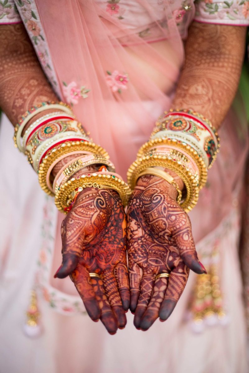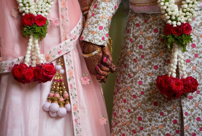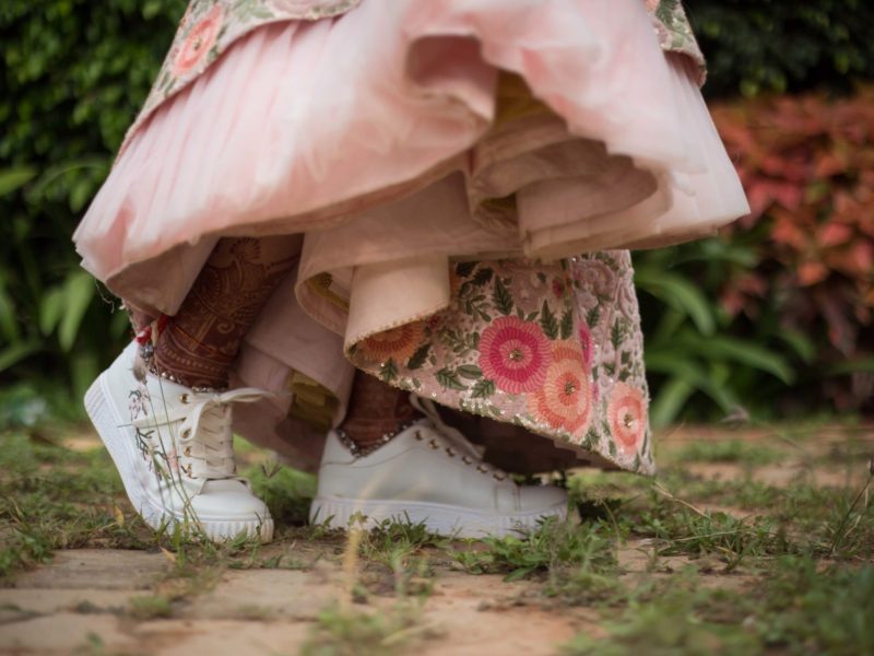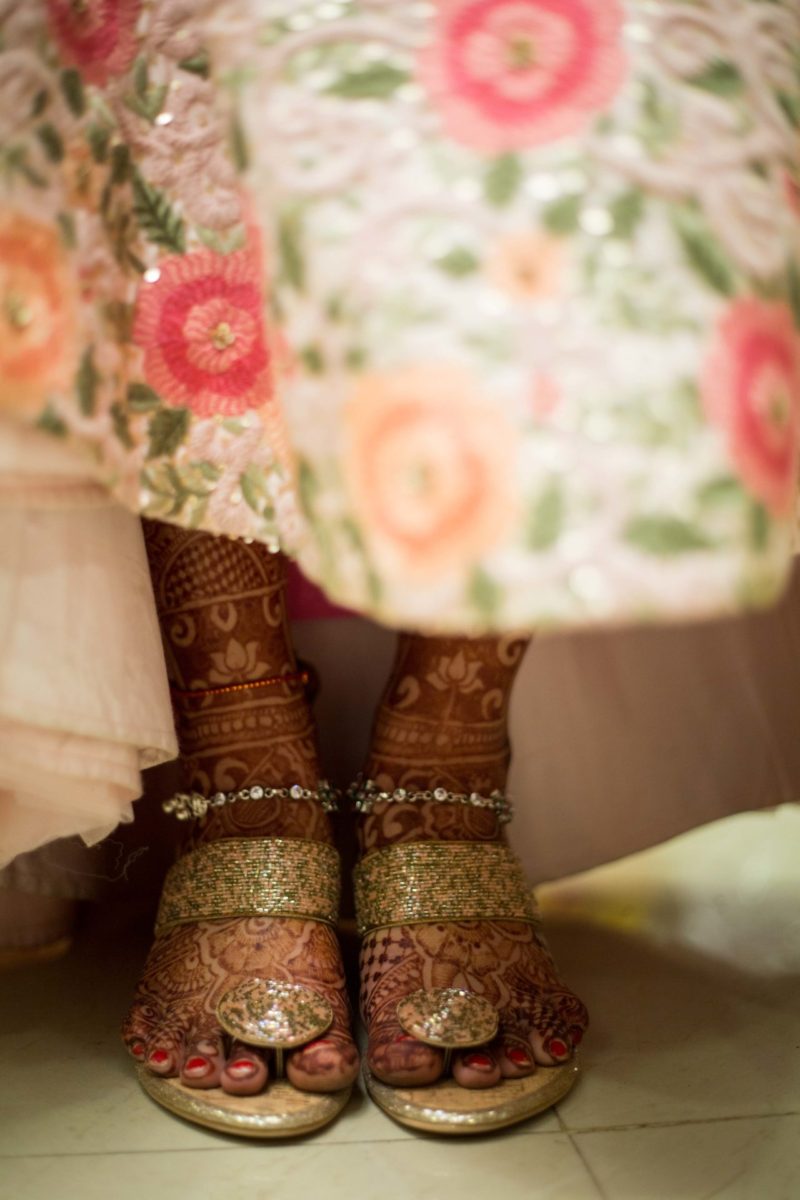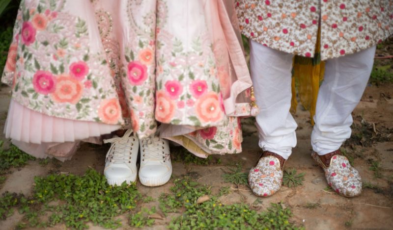 Payal looked elegant in her wedding outfit, of the loveliest pastel pink color with beautiful floral embroidery. It was paired with pearl & gold jewellery with pink undertones and a pair of the comfiest sneakers with floral work. Shreyans looked absolutely daper in his custom floral embroidery sherwani & mojris. Their outfits were matched beautifully!